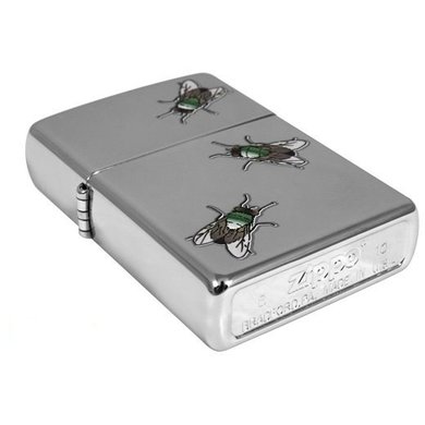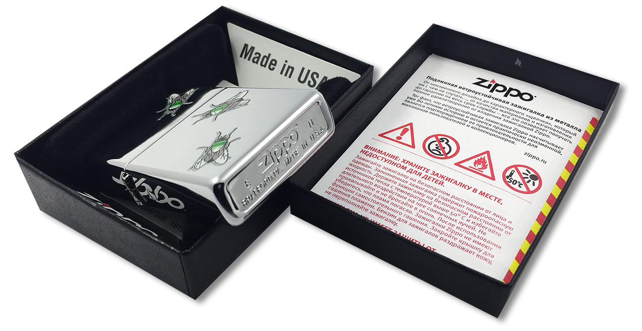 100% Оригинал.США. Серебристая глянцевая зажигалка Zippo с нарисоваными мухами. Зажигалка продается не заправленной. У нас вы можете купить товар оптом и в розницу.